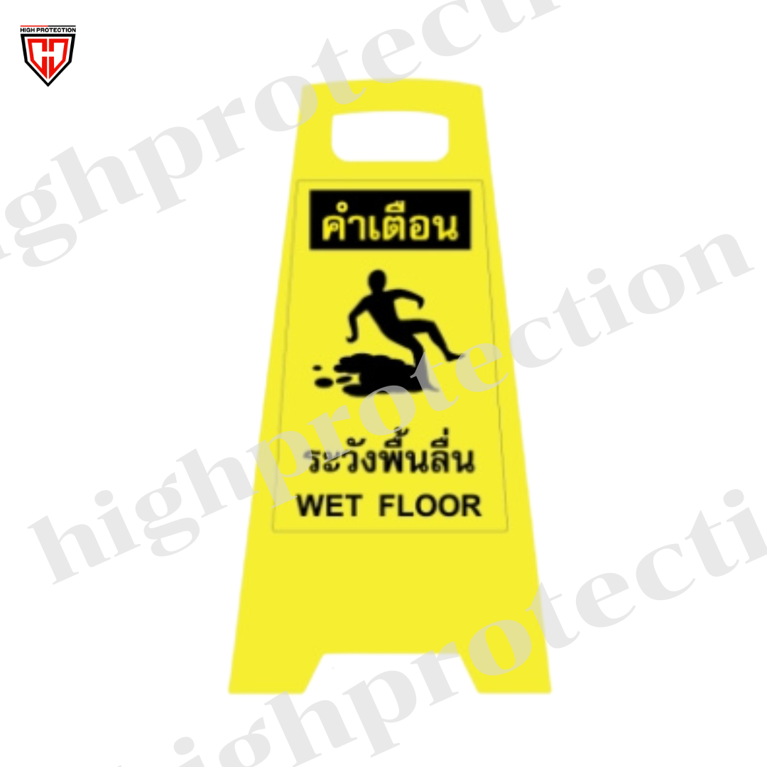 ป้ายตั้งพื้นสีเหลือง ระวังพื้นลื่น